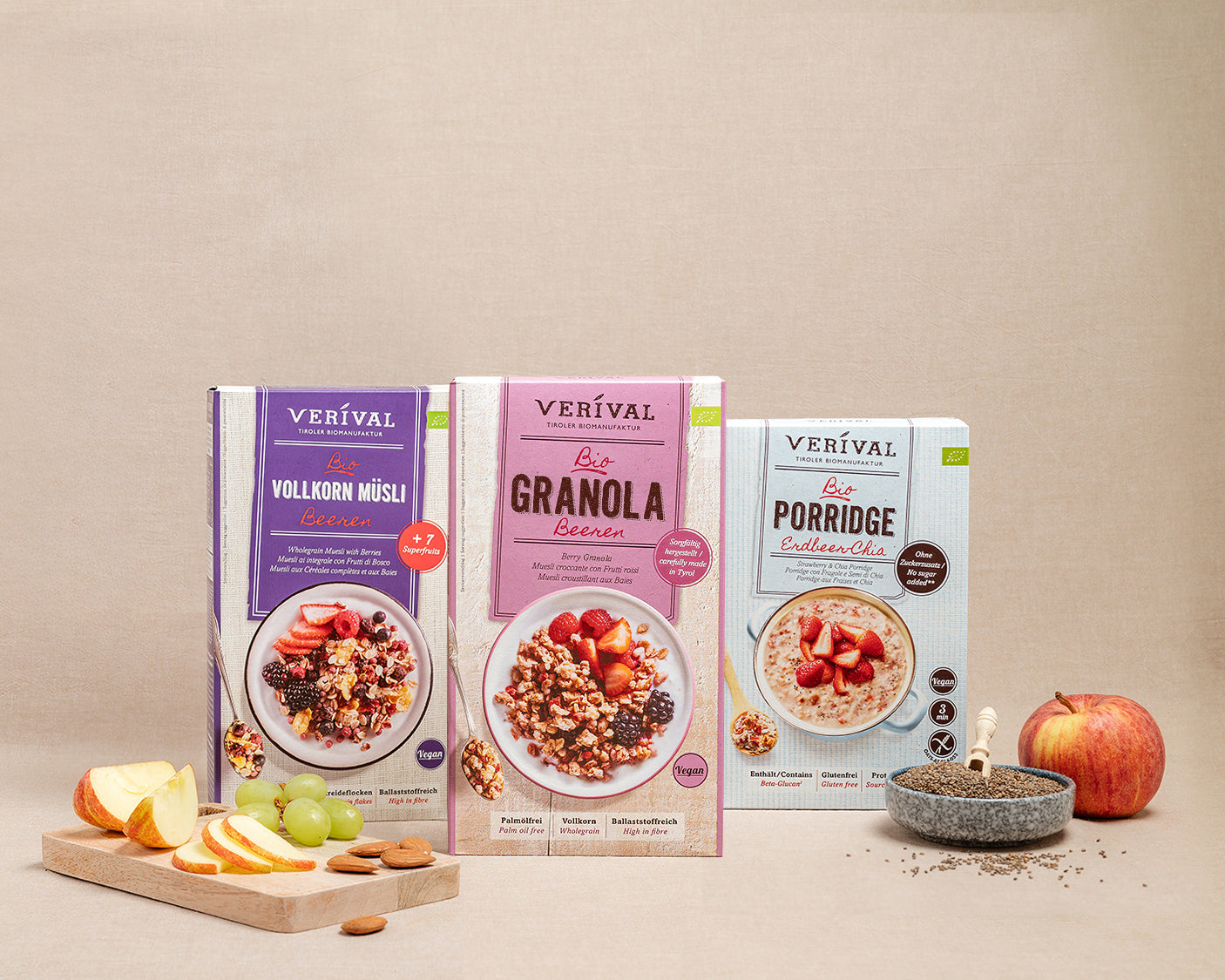 Per Verival, ogni muesli, granola, croccante e porridge è prodotto con cura in Tirolo. Utilizziamo solo ingredienti biologici di alta qualità nella nostra fabbrica biologica di Langkampfen. Per quanto riguarda i partner e i fornitori, prestiamo attenzione alla regionalità quando possibile e ci concentriamo esclusivamente sulla qualità biologica, sulla sostenibilità e su condizioni di lavoro eque.