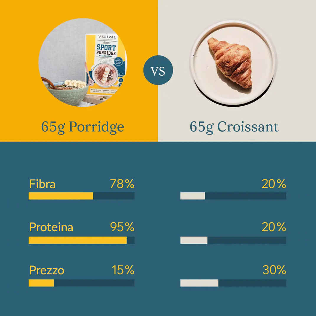 La densità nutritiva è il rapporto tra i nutrienti contenuti in un alimento e le calorie che contiene. Più nutrienti contiene un alimento per caloria, maggiore è la sua densità nutritiva. Il porridge contiene 5 volte più fibre di un croissant.