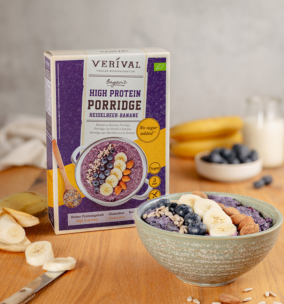 I cereali, le noci e i semi costituiscono la base dei nostri porridge, delle granole e dei mueslis. Si tratta di importanti fonti proteiche di origine vegetale, che svolgono un ruolo particolarmente importante in una dieta vegana. L'avena del nostro Porridge Verival ti fornisce un apporto ottimale di proteine, che ti aiutano a costruire i muscoli e ti mantengono sazio a lungo. Con una porzione di porridge al mattino, assumi già il 20-25% del tuo fabbisogno proteico giornaliero.