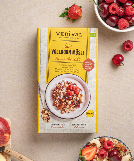 Inizia la giornata con il muesli integrale di Verival. I nostri mix di muesli a base di ingredienti biologici offrono varietà e gusto per una colazione sana. Verival utilizza cereali integrali regionali come farro, einkorn, farro, segale e avena. I nostri cereali, fiocchi e cornflakes sono prodotti con i migliori ingredienti biologici. Acquista comodamente online e goditi una colazione sostenibile.