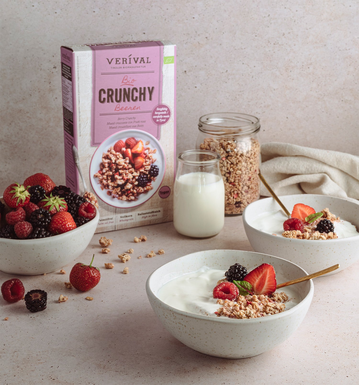 Scopri le deliziose varietà di muesli e granola croccanti di Verival. I nostri croccanti contengono solo i migliori ingredienti biologici come farro, noci selezionate e cocco, cotti in olio di girasole ecologico. Ogni muesli di granola è fatto a mano in Tirolo e viene dolcificato con parsimonia con il miele per preservarne il sapore naturale. Disponibile direttamente su Verival online.
