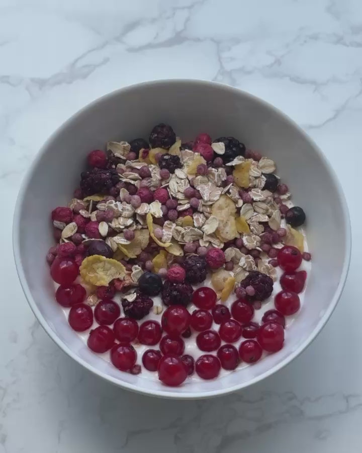 Il muesli integrale è ricco di fibre grazie all'avena e al grano integrali. Questo garantisce una digestione sana e un senso di sazietà duraturo e fornisce all'organismo molta energia. I frutti di bosco contengono inoltre numerose vitamine e minerali che supportano tutti i processi dell'organismo. Il muesli integrale ai frutti di bosco è quindi ideale per una colazione sana ed equilibrata.