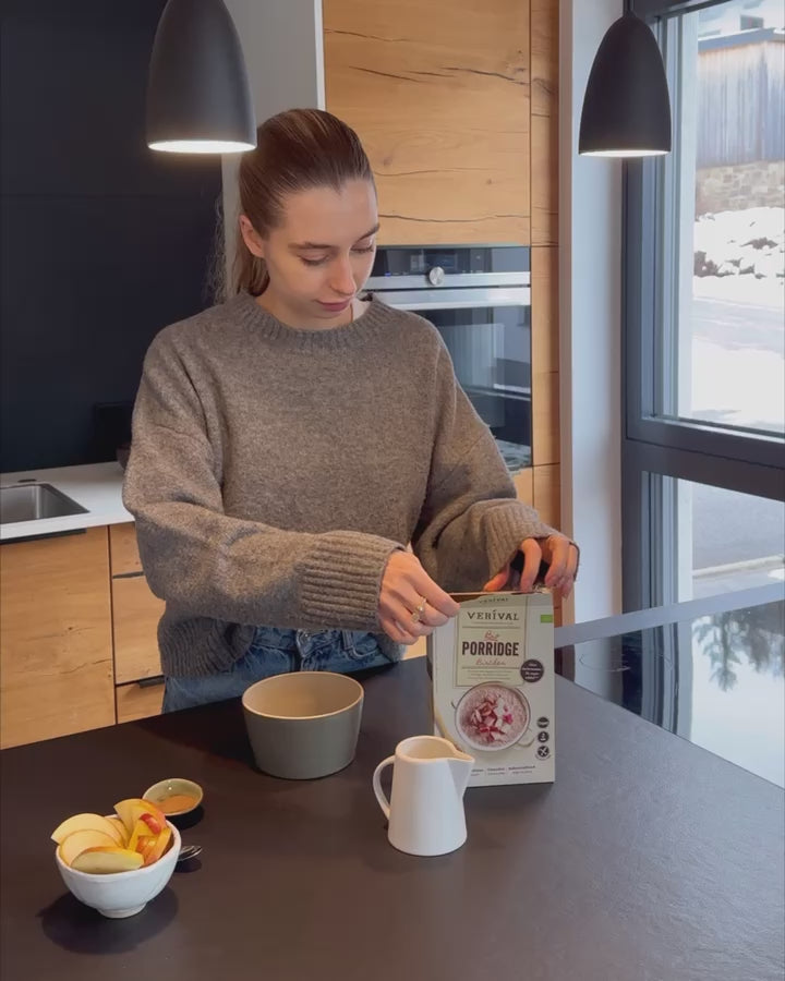 Una colazione sana e calda facile da preparare: 100 g di porridge ti forniscono il 26% del fabbisogno giornaliero di fibre, il 17% delle proteine necessarie e tutti gli aminoacidi essenziali. Inoltre, è puramente vegetale e non contiene zuccheri aggiunti.