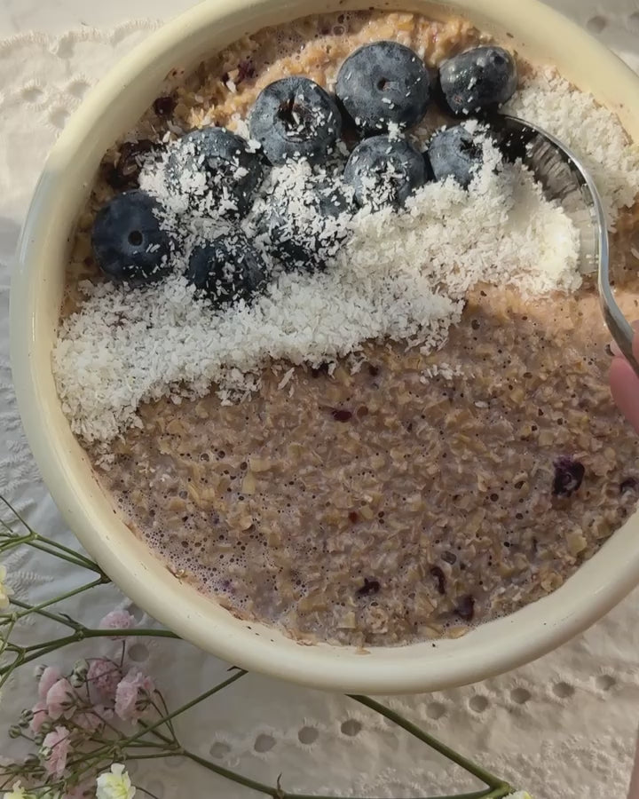 Il porridge fornisce al tuo corpo tutti i nutrienti importanti a colazione, è facile da digerire e fa bene al tuo sistema immunitario. I carboidrati complessi contenuti nella crusca d'avena fanno sì che lo zucchero nel sangue aumenti lentamente, mantenendoti sazio più a lungo e prevenendo le voglie. L'avena garantisce inoltre una sana digestione grazie alle fibre che contiene. Le more contengono inoltre importanti vitamine e minerali. Il nostro porridge può essere preparato in soli 3 minuti, senza alcuna cottura.