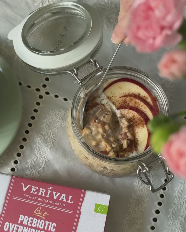 Siete alla ricerca di una colazione semplice e sana che favorisca anche la vostra digestione? Allora i nostri deliziosi Prebiotic Overnight Oats sono la colazione giusta per voi! La nostra Avena Prebiotica per la notte Mela-Chia, con le fibre prebiotiche dell'inulina della cicoria, del topinambur, dei semi di chia e della buccia di psillio, funge da alimento per i batteri intestinali benefici e ha un effetto positivo sulla composizione e sull'attività dei batteri intestinali.L'avena per la notte è anche particolarmente veloce da preparare. È sufficiente mescolare 50 g di avena notturna con circa 120 ml di latte freddo o di bevanda a base vegetale e riporre l'avena in frigorifero per tutta la notte. È possibile utilizzare facilmente frutta fresca, noci o semi come guarnizione per l'avena notturna. L'avena per la notte fornisce al corpo tutti i nutrienti importanti a colazione, è facile da digerire e fa bene al sistema immunitario. I carboidrati complessi dell'avena integrale fanno sì che la glicemia aumenti lentamente, mantenendo il senso di sazietà più a lungo e prevenendo le voglie. L'avena integrale e i semi di chia garantiscono inoltre una sana digestione grazie alle fibre che contengono. Le mele contengono inoltre vitamine e minerali importanti e l'ammollo dell'avena durante la notte riduce il contenuto di acido fitico. Questo metodo di preparazione consente al corpo di assorbire fino al 30% in più di sostanze nutritive. L'ammollo aumenta inoltre la digeribilità.