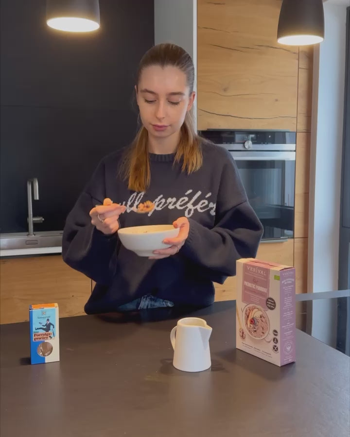 Una colazione sana e calda facile da preparare: 100 g di porridge prebiotico ti forniscono il 52% del fabbisogno giornaliero di fibre, il 20% delle proteine necessarie e tutti gli aminoacidi essenziali. Ed è puramente vegetale, senza zuccheri aggiunti.